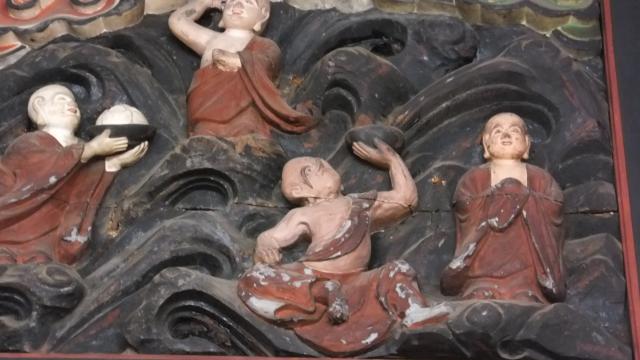 その後、仏具等を仮安置致すためのプレハブの建築、建築関係者の皆さんの休憩頂くための工事車両等を受け入れるための鉄板の敷く準備などを進めてくださいました。そして、本堂内は、仏具の移動を無事終了致しましたが、欄間(佛菩薩)及びお不動様宮殿の修復のため仏具店移動してあります。また、2月27日~3日間かけて、阿弥陀様の安置されていました壁に天女並びに蓮などの壁画も修復のために専門家が京都より来寺し、取り外し作業に入ってくれました。実は片づけておりましたところ、寶永年間に当山第十三世信蓮社仰譽上人が再建されたとある。涅槃図(4畳程)と観経曼荼羅(4畳程)の二幅が出てまいりました。正に寺宝とみて良いでしょう。